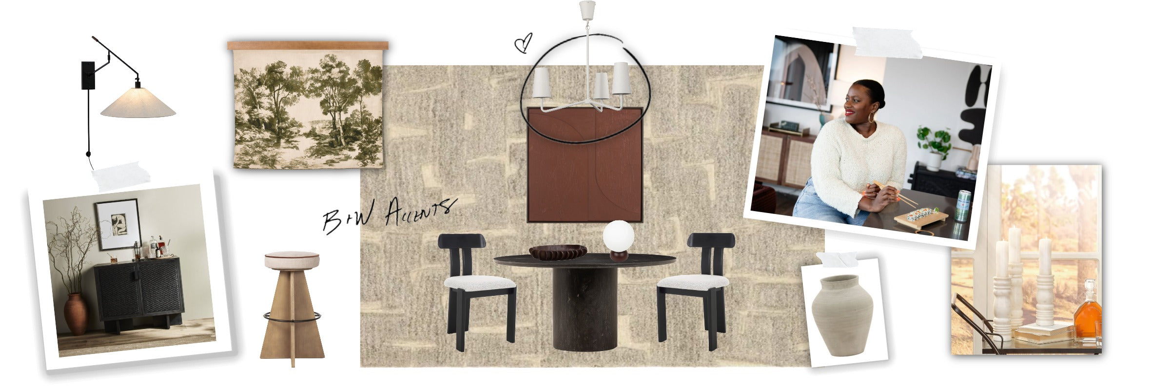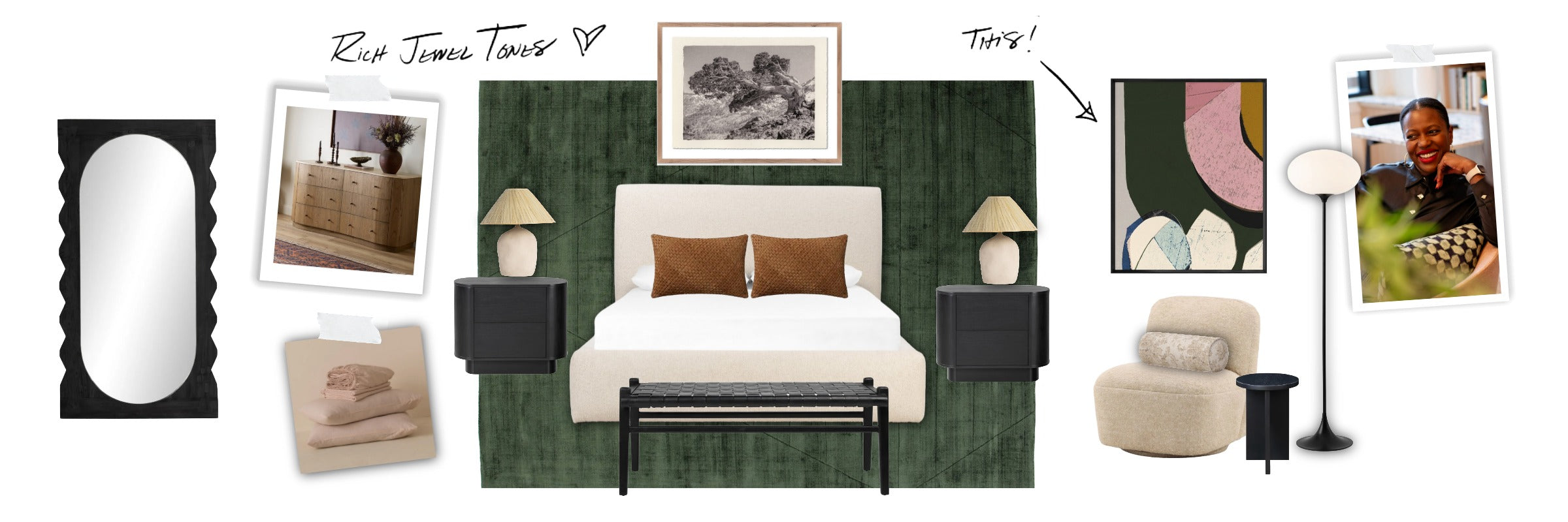 Rich jewel tones are my jam. Black and white accents with cozy and nostalgic furniture pieces bring me joy. I encourage you to have fun with your space, explore fearlessly and let your inner voice guide you.